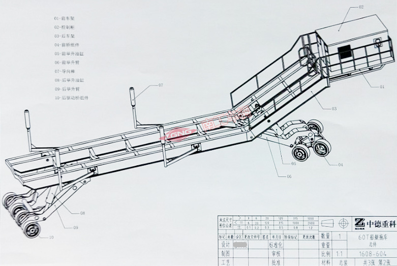 1、拖車承載拖行能力為60噸,平臺主框架采用30號型鋼,主梁四條50號高錳合金型鋼,最大寬度4米,長度為19.8米,為方便運輸整車設計為組件拼裝式,頂前部為電控箱、電池及液壓系統(tǒng)。底前部為轉(zhuǎn)向機構(gòu)控制系統(tǒng)。底部為兩套升降拖船支撐平行調(diào)整機構(gòu)。兩側(cè)各設計兩套可調(diào)視寬導向棒。
