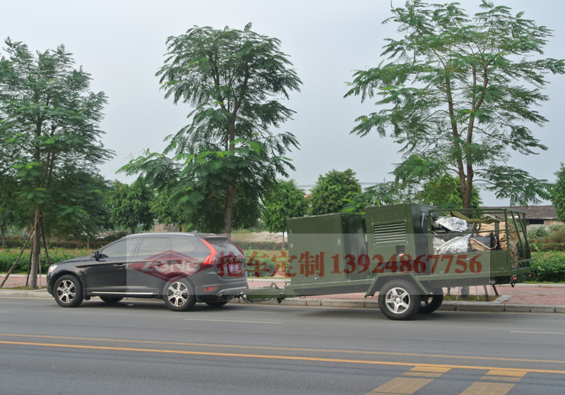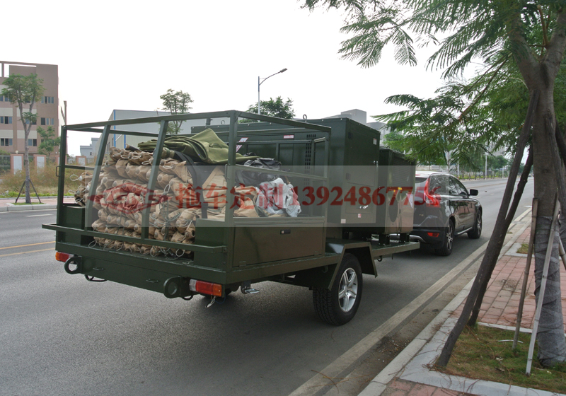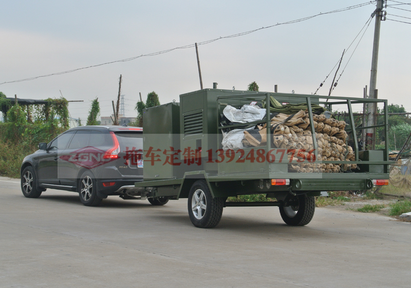 本拖掛車為客戶特定要求定制,拖車可裝載發(fā)電機、冷暖風機、大型帳篷,可為越野露營、野外作戰(zhàn)提供舒適的場所。